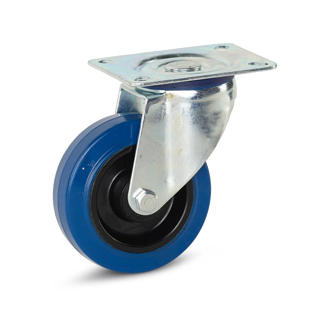 Blauw elastisch rubber zwenkwiel met topplaat - 100mm - 130kg