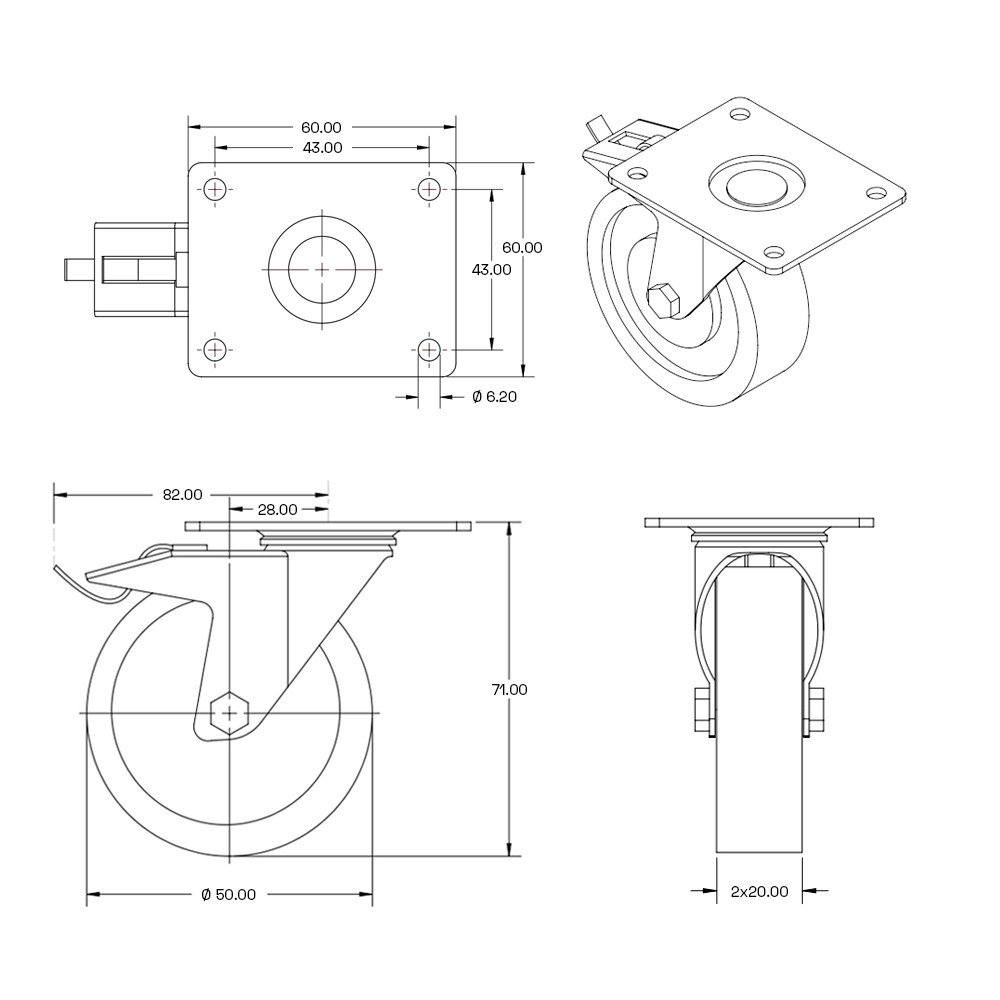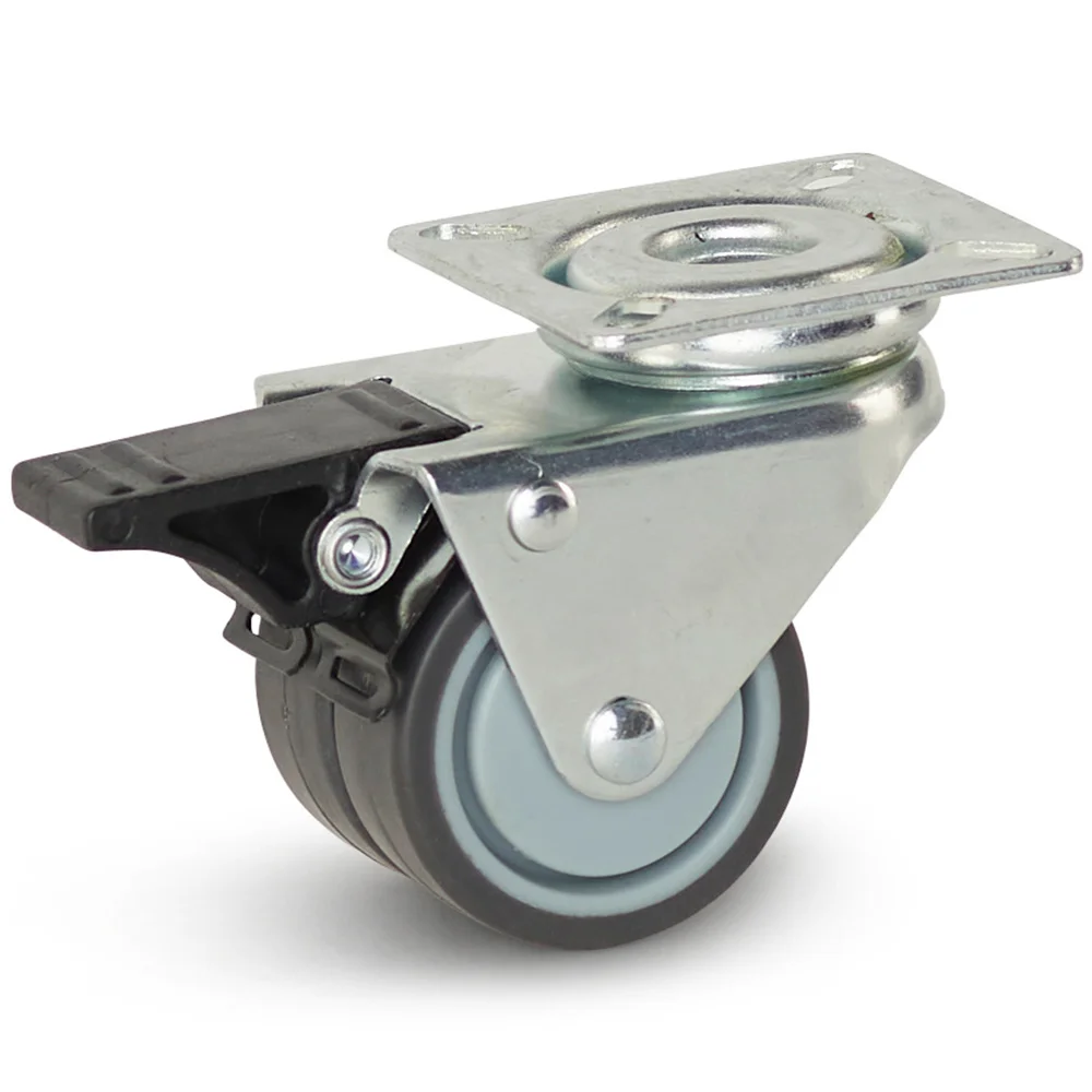 Dubbel zwenkwiel geremd met topplaat - 50mm - 90kg