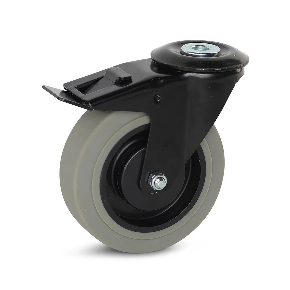 Grijs Rubber zwenkwiel zwarte behuizing geremd met centraal gat - 125mm - 180kg