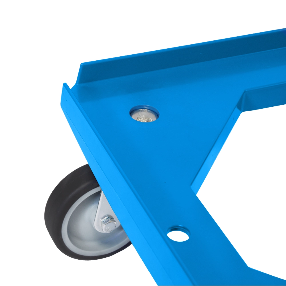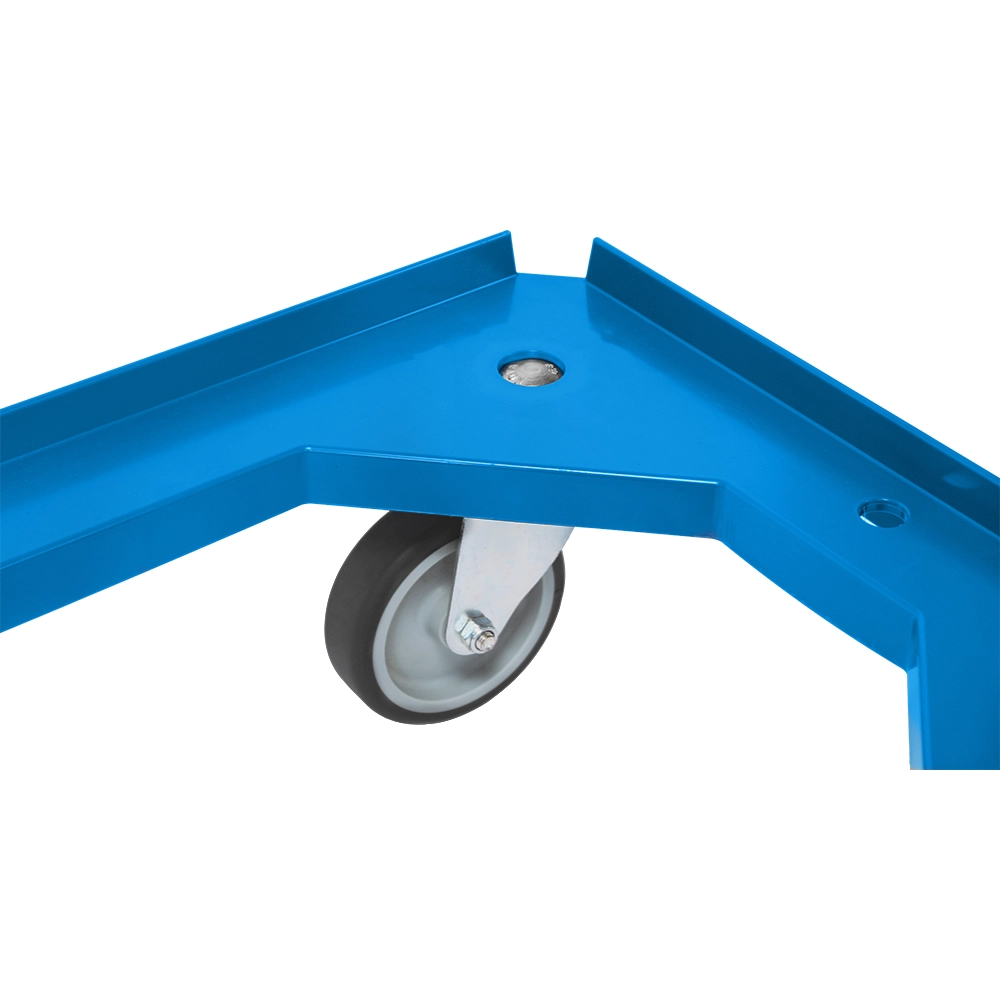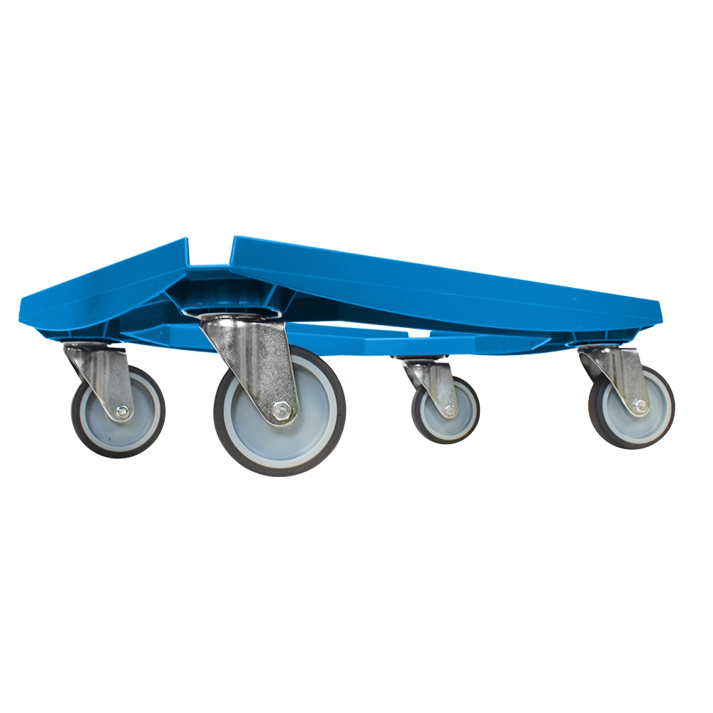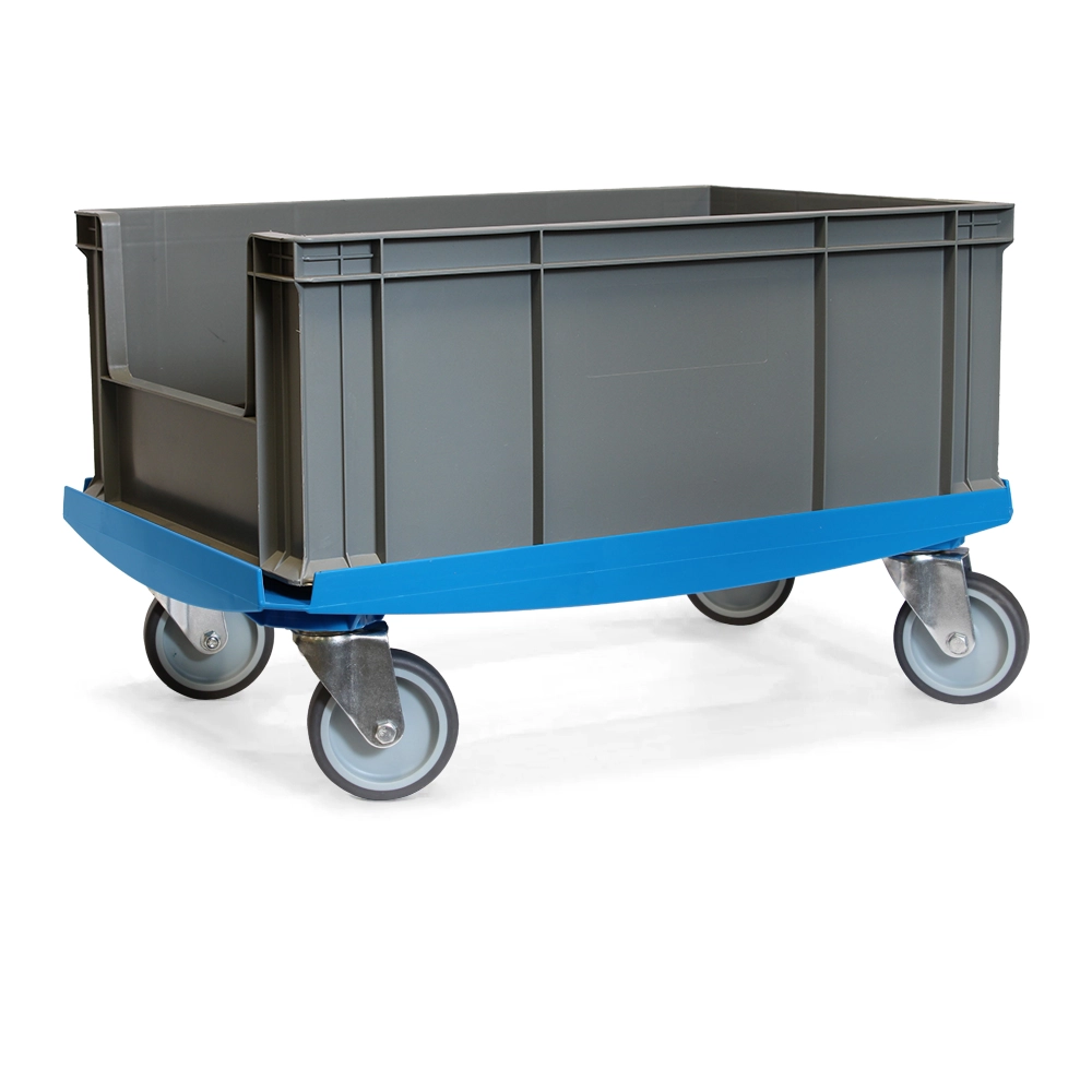 Stevige blauwe onderwagen met vier TPR zwenkwielen, ideaal voor het verplaatsen van ladingen tot 250kg.