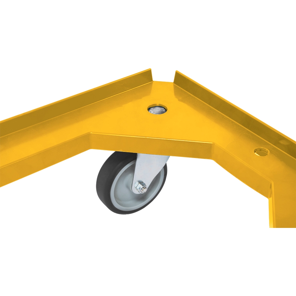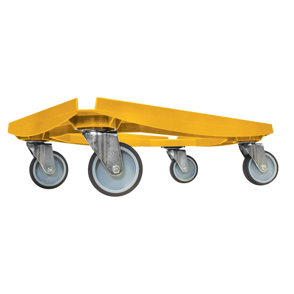 Gele onderwagen, geschikt voor het transporteren van ladingen tot 250kg met vier TPR zwenkwielen voor eenvoudige manoeuvreerbaarheid.