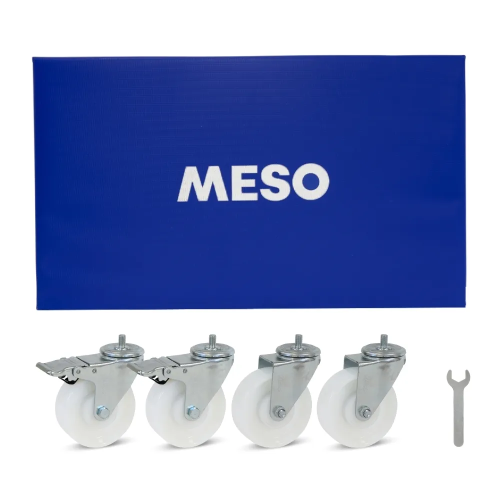 De nylon wielen bieden lage rolweerstand op harde vloeren. De twee remmen zorgen voor veilige hantering bij stilstand.