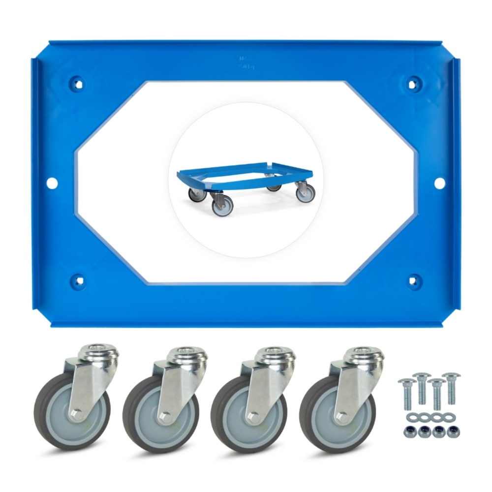 Stevige blauwe onderwagen met vier TPR zwenkwielen, ideaal voor het verplaatsen van ladingen tot 250kg.