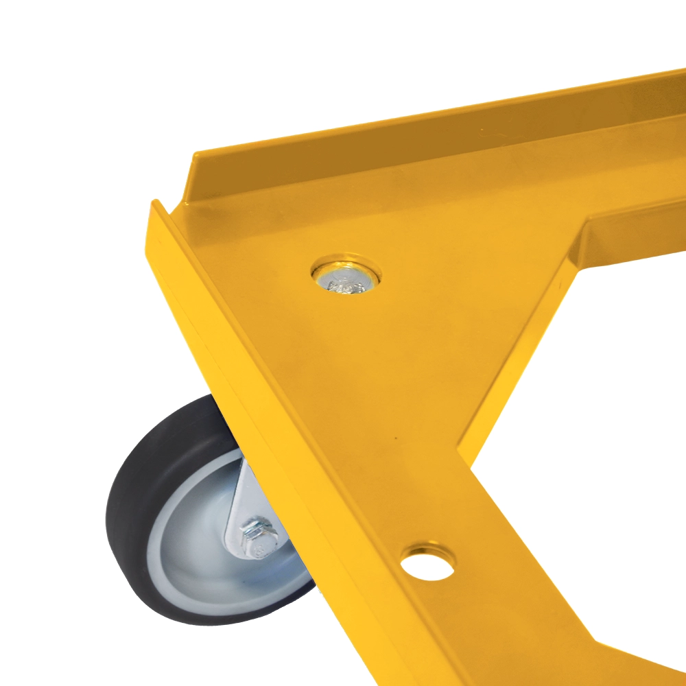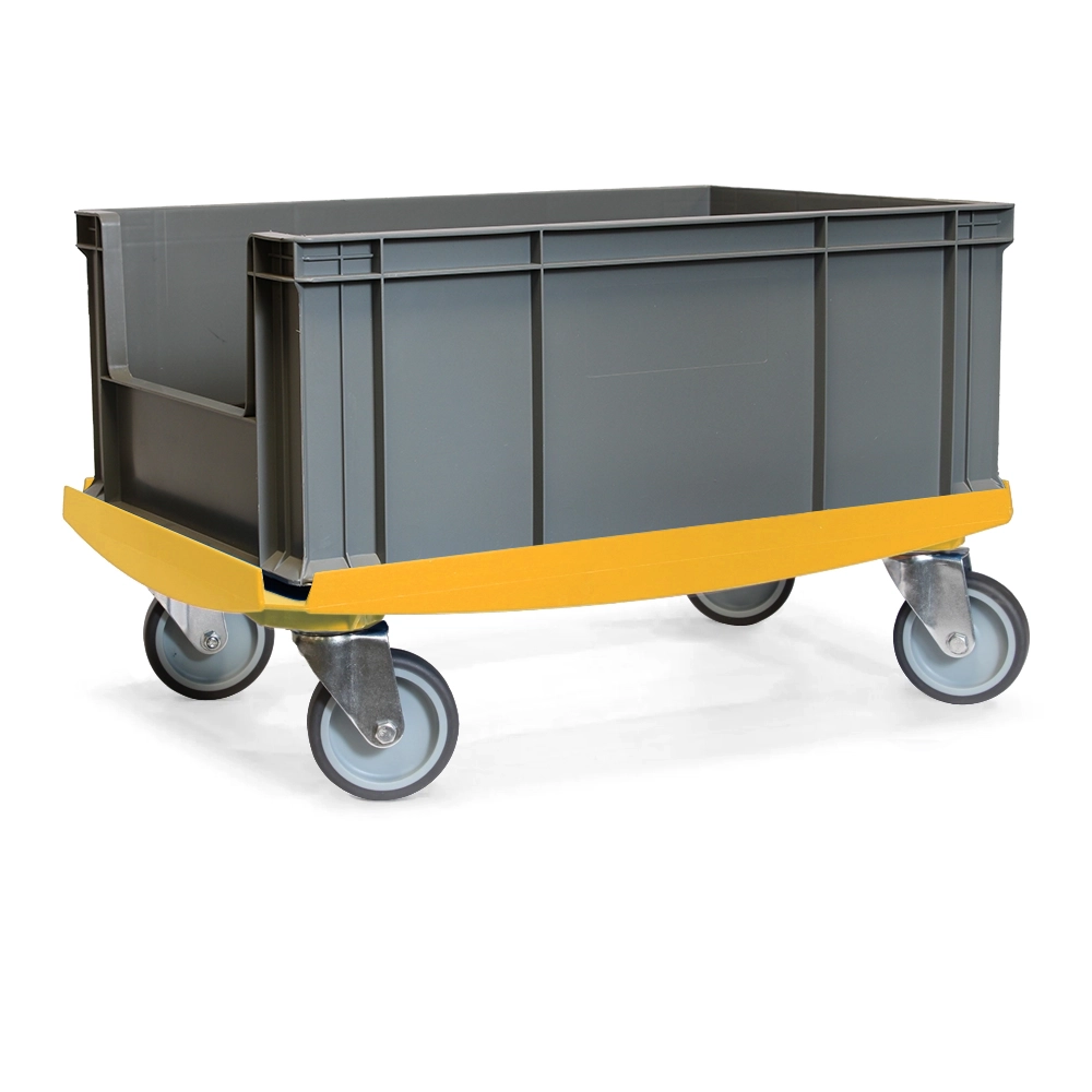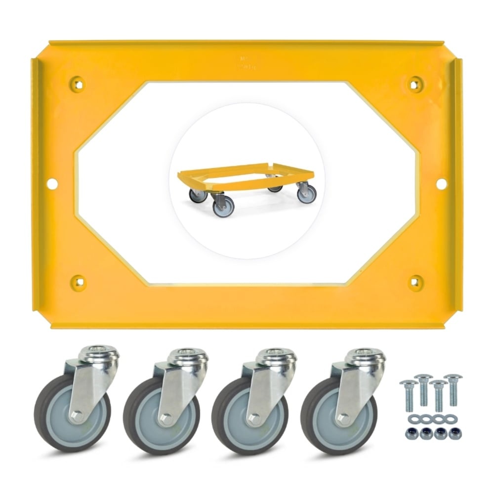 Gele onderwagen, geschikt voor het transporteren van ladingen tot 250kg met vier TPR zwenkwielen voor eenvoudige manoeuvreerbaarheid.