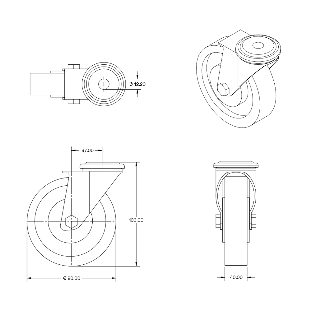 PU zwaarlast zwenkwiel met boutgat - 80mm - 300kg