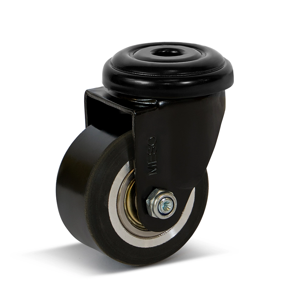 Dit PU zwenkwiel van 50mm met centraal bevestigingsgat is ideaal voor compacte toepassingen met hoge belastingseisen. De robuuste zwarte PU-band zorgt voor een stille loop en uitstekende bescherming van de vloer. Met een draagvermogen van 120kg is dit wiel geschikt voor meubels, transportmiddelen en licht industrieel gebruik.