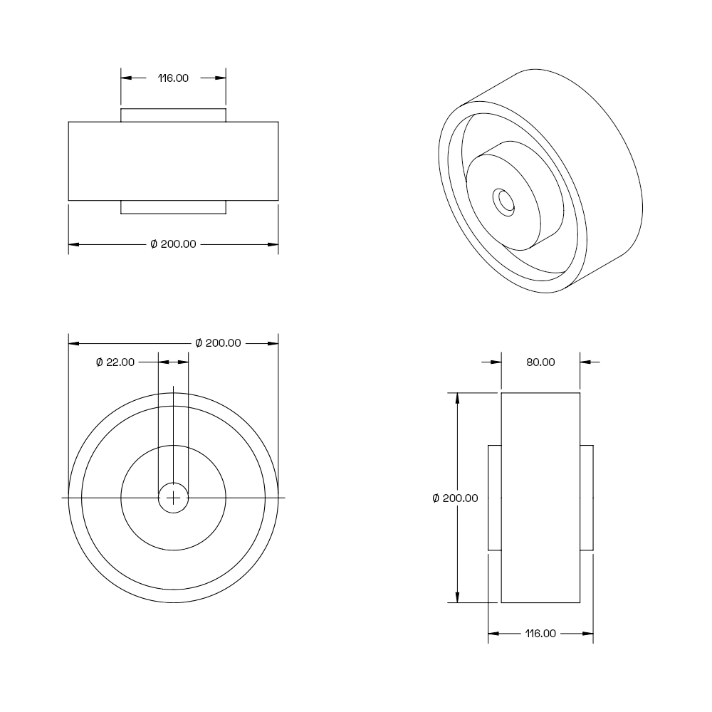 Breed rubberen wiel met een diameter van 200 mm en een draagvermogen van 600 kg, ideaal om te combineren met zwenk- of bokwielbehuizingen.