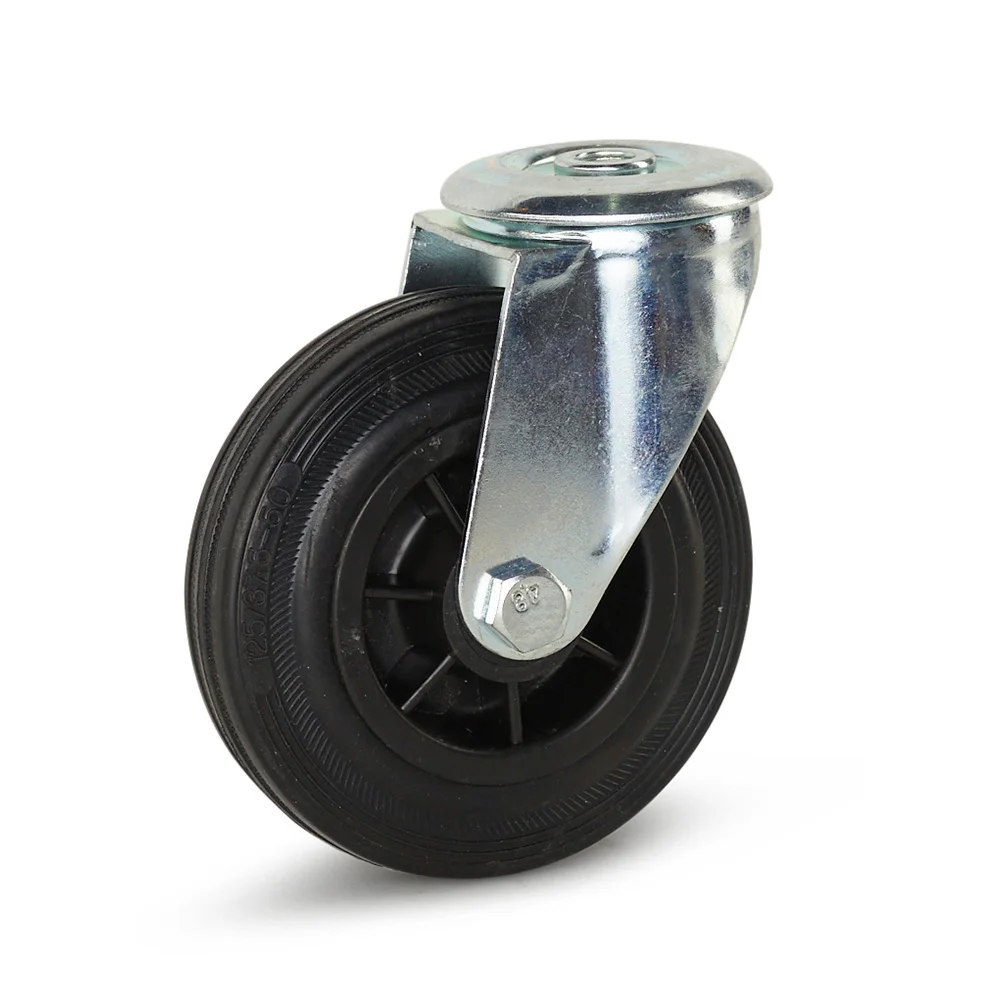 Dit rubberen zwenkwiel heeft een diameter van 125 mm en een draagvermogen van 125 kg.