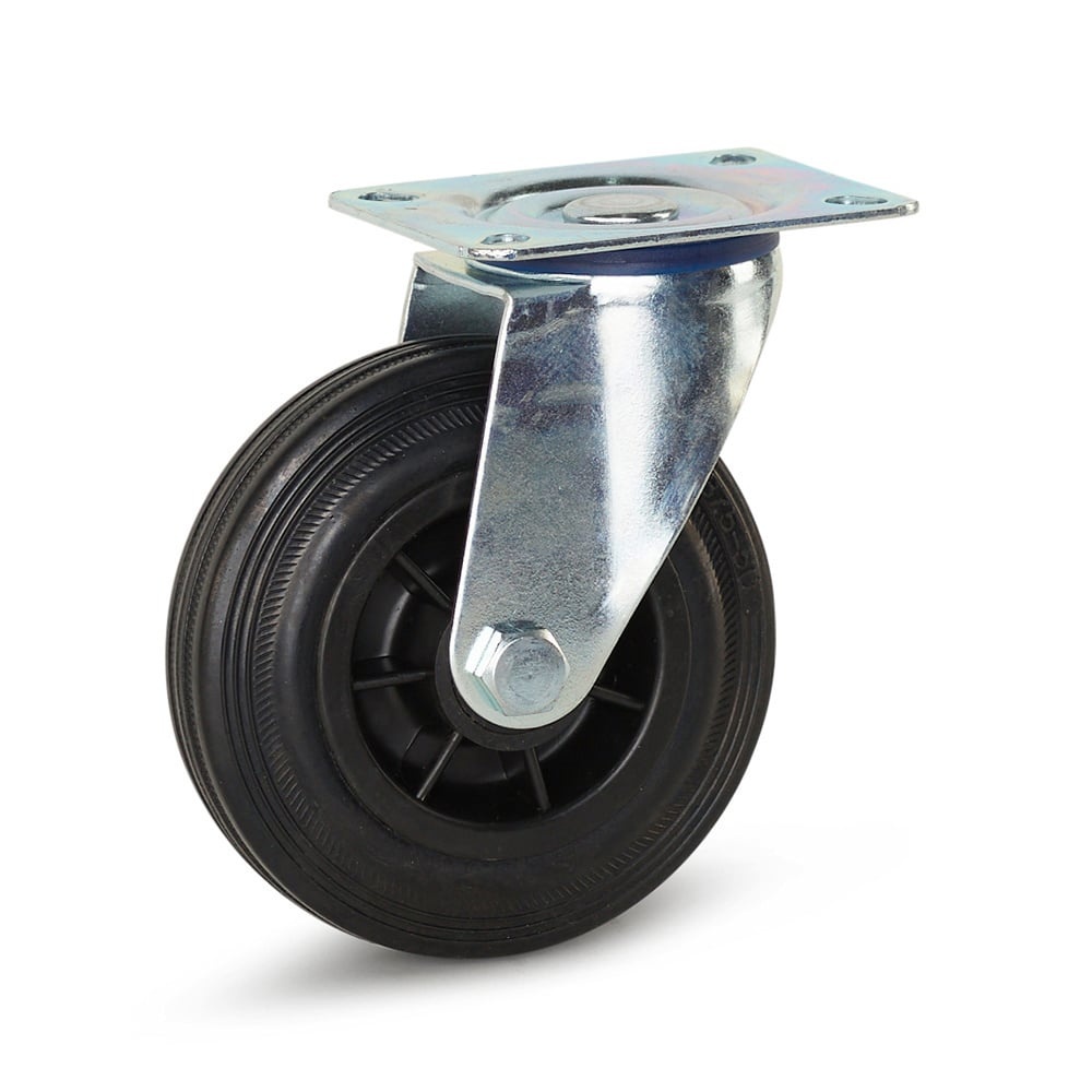 Dit rubberen zwenkwiel heeft een diameter van 125 mm en een draagvermogen van 125 kg.