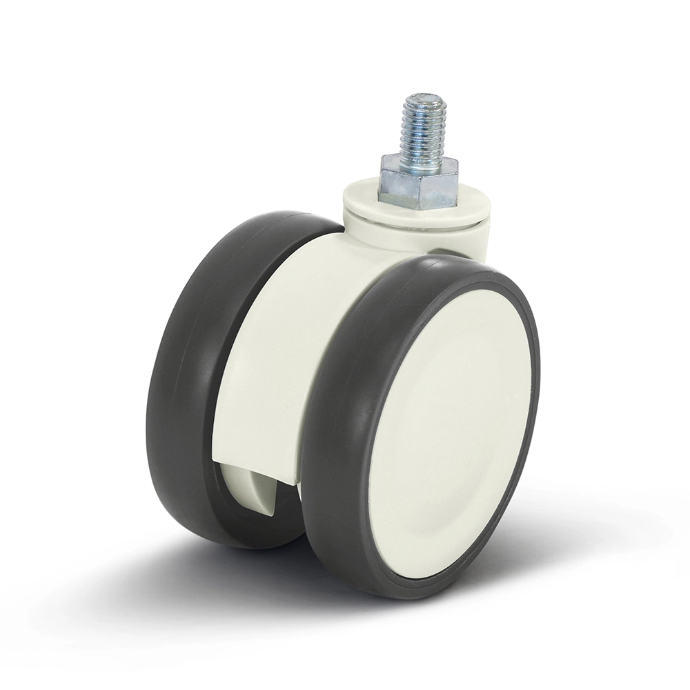 Dit wit dubbel meubel zwenkwiel met schroefdraad heeft een diameter van 75 mm en een draagvermogen van 80 kg. De band is gemaakt van thermoplastisch rubber en de wielbody van polypropyleen.