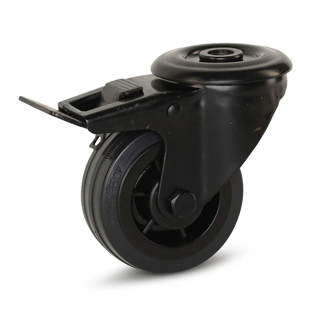 Zwart rubber zwenkwiel geremd met centraal gat - 80mm - 60kg ZLO
